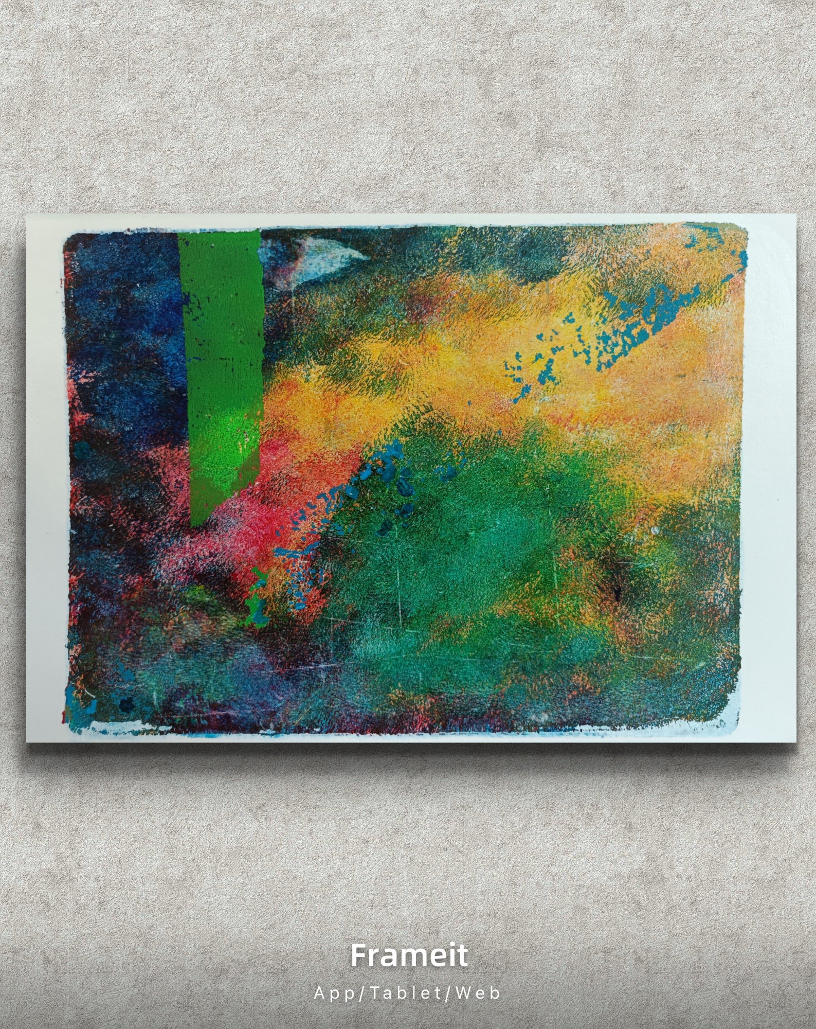 The piece is a hand-pulled layered mono print. That means, it is not a painting but a method to make a print using acrylic (and other water based mediums) using a gel plate. The gel plate transfers the medium and image to paper. Once it is ‘printed’, it can’t be changed. The piece you collect is an original, and there won’t be any further digital prints made from it. When you purchase this piece, it is exclusively yours.