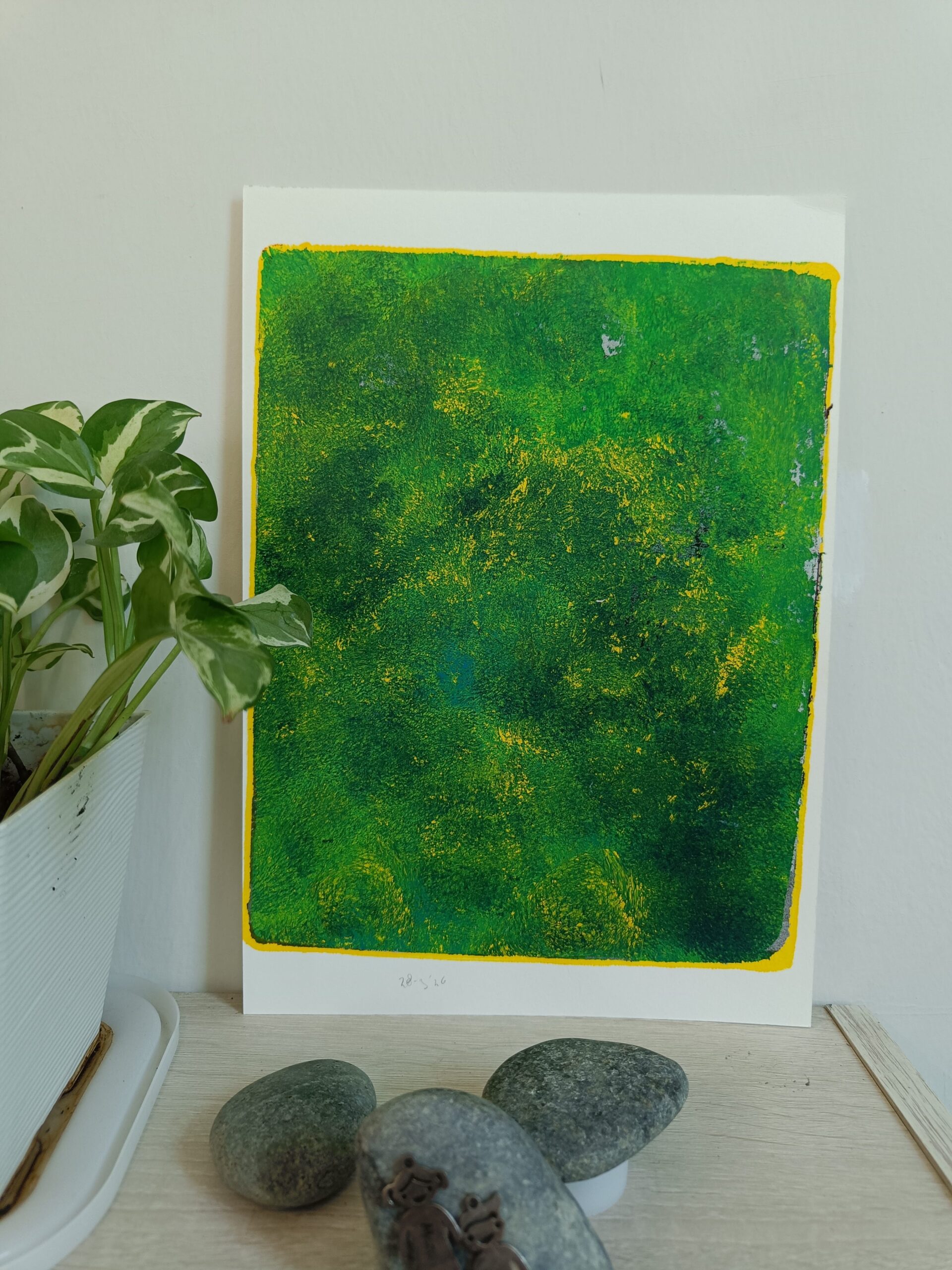 Hand-pulled layered mono print on 300gr non-archival watercolour paper.